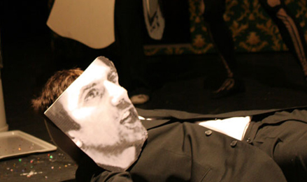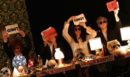Im Selbstversuch wird Heiner Müllers „Hamletmaschine“ zu einem Spiel, dessen Einsatz der Text ist: „end of drama, begin of game“. Auf der Bühne steht ein Glücksrad, die Spielfelder entsprechen den fünf Akten, der Zufall bestimmt die Dramaturgie des Abends – und ein Showmaster, der die Texttreue der Spielenden auf die Probe stellt. Die Darbietung ist Konzert und kollektive Lektüre zugleich, Spaziergang durch den Text und Geisterfahrt durch die Geschichte: Hamlet, hin- und her gerissen zwischen Melancholie & Revolte in Ost-Berlin 1953, Budapest 1956, Stuttgart-Stammheim 1977: „Mein Drama, wenn es noch stattfinden würde, fände in der Zeit des Aufstands statt.“ Ophelia geistert durch das bürgerliche Wohnzimmer, in dem die Dinge allmählich außer Kontrolle geraten: Wände verschieben sich, Sofas greifen an, der Schrank wird zur Mördergrube, ein einsames Herz blutet vor sich hin und singt zum Abschied leise Servus. „Dänemark ist ein Gefängnis, zwischen uns wächst eine Wand. Sieh was aus der Wand wächst. Exit Polonius.“