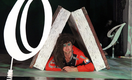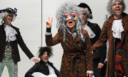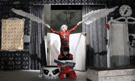 andcompany&Co. come up with a new version of Lenz’ ingenious parody of a genius „Pandämonium Germanicum”: He wanders about hauntingly in his room, he sleeps in oversized books, duels himself, flies across the mountains on writing feathers, and he makes annotations on theatre: “In my imagination I am building an incredible theatre, where in front of our eyes we shall have a defile of the most famous actors of old and new times.” Sometimes he wanders across the mountains, sometimes he does something foolish, sometimes he lives in the forest: Lenz in the loop.